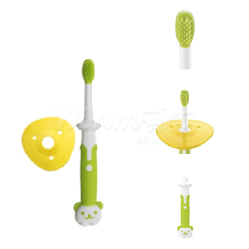 - Có khiên màu vàng đi kèm, dùng để lắp vào bàn chải khi đánh răng, ngăn việc đưa bàn chải vào sâu trong họng giúp đảm bảo bé không bị hóc khi đánh răng.