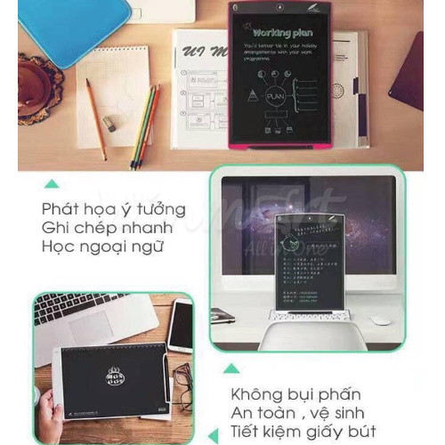Bảng viết thông minh được thiết kế siêu mỏng, nhẹ và chắc chắn giúp bạn dễ dàng mang đi mọi lúc mọi nơi. Bảng không sử dụng phấn hay bút mực thay vào đó là màn hình đặc biệt kèm theo bút viết cảm ứng đặc biệt, sử dụng không giới hạn, thỏa sức sáng tạo. Chỉ cần ấn vào biểu tượng thùy rác là sẽ xóa toàn bộ, rất nhanh và tiện dụng.