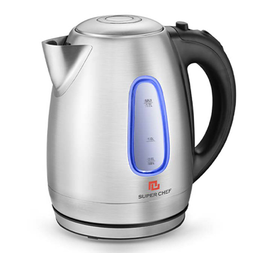 - Bình đun siêu tốc Super Chef SC_KS1721 được thiết kế kiểu dáng, màu sắc hiện đại và không kém phần sang trọng. Thân bình và lồng bình được làm bằng thép không gỉ cao cấp giúp truyền nhiệt nhanh, rất an toàn và độ cứng cao nên hạn chế nứt vỡ trong quá trình sử dụng. Tay cầm bằng nhựa chịu nhiệt nên rất an toàn cầm nắm di chuyển khi sử dụng.