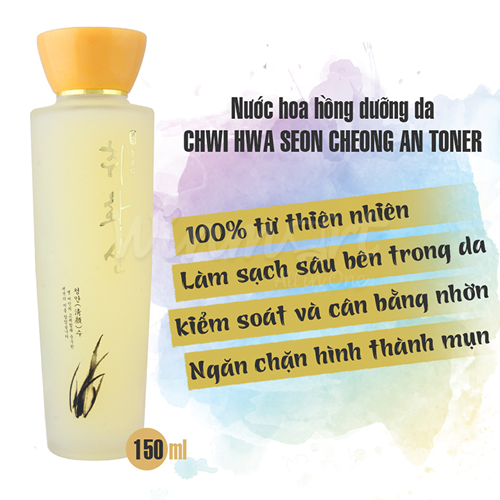 >> Nước hoa hồng dưỡng da CHWI HWA SEON CHEONG AN TONER 150ml Nước hoa hồng Đông Y dưỡng da có khả năng làm sạch sâu, lấy đi các bụi bẩn còn sót lại trên bề mặt da, cân bằng pH tự nhiên từ đó kiểm soát và cân bằng sự sản sinh chất nhờn cho cả da dầu và da khô, duy trì độ ẩm mịn của da, đồng thời giảm viêm, thu nhỏ lỗ chân lông và hạn chế sự hình thành mụn.