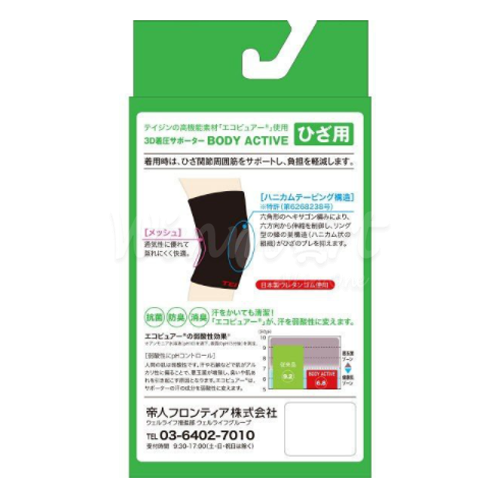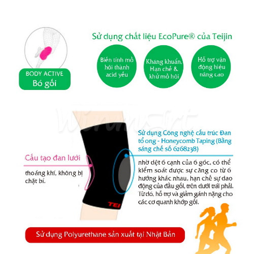 - Sử dụng cho đầu gối, áp dụng công nghệ được cấp bằng sáng chế "cấu trúc honeycomb taping" (đan tổ ong). Sản phẩm được dệt 6 cạnh của 6 góc, có thể kiểm soát được sự căng co từ 6 hướng khác nhau, hạn chế sự dao động của đầu gối, trên dưới trái phải. Cấu tạo đan lưới của đoạn bó phía sau gối tạo cảm giác luôn khô thoáng.