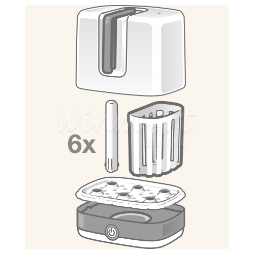 • Máy tiệt trùng bình sữa NUK có thể khử trùng 6 bình sữa cổ điển không nắp đậy và phụ kiện một cách nhanh chóng và đáng tin cậy trong giỏ rời.