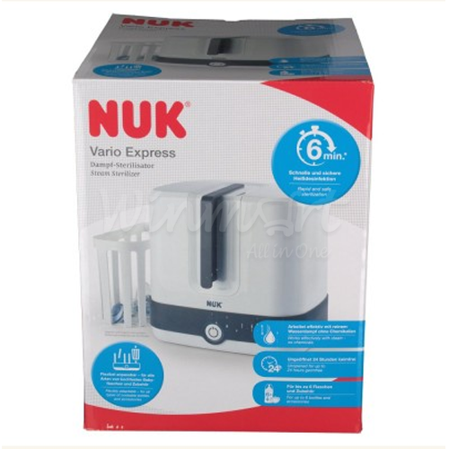 Máy tiệt trùng bình sữa NUK Vario Express sử dụng công nghệ khủ trùng bằng hơi nước trên 90°C sẽ nhanh chóng loại bỏ các loại vi khuẩn có hại ẩn náu trong bình sữa, ti ngậm, múm vú và phụ kiện máy hút sữa. Với khoang chứa 6 bình cổ rộng và phụ kiện, máy tiệt trùng bình sữa NUK là một giải pháp hoàn hảo cho cuộc sống gia đình bận rộn dễ dàng hơn nhiều nhờ thiết kế đơn giản và dễ sử dụng. Đồng thời, máy tiệt trùng bình sữa NUK mang đến sự tiện lợi tối đa, với 6 thanh và giỏ có thể định vị lại cho các phụ kiện có thể được sắp xếp theo yêu cầu giúp cho mẹ có thể khử trùng 6 bình sữa cổ rộng và phụ kiện.