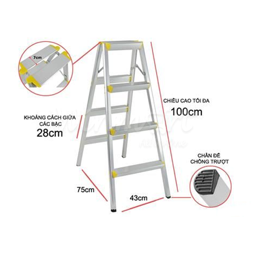 - Thang được làm từ chất liệu nhôm chống gỉ, chống sét - Chân thang được bọc cao su giúp chống trượt - Thang chữ A NKD-04 đạt tiêu chuẩn an toàn Châu Âu EN131, cho độ bền vượt trội và chắc chắn.
