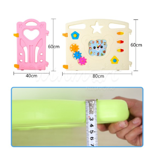 - Bộ quây cũi cỡ trung bao gồm 16 tấm ghép, trong đó có 1 hoặc 2 tấm ghép cửa. Miếng nhựa nhỏ có kích thước R40cm*C60cm, miếng to có kích thước R80cm*C60cm, mang đến không gian rộng cho bé thoải mái vận động và vui chơi trong chính căn nhà của mình.