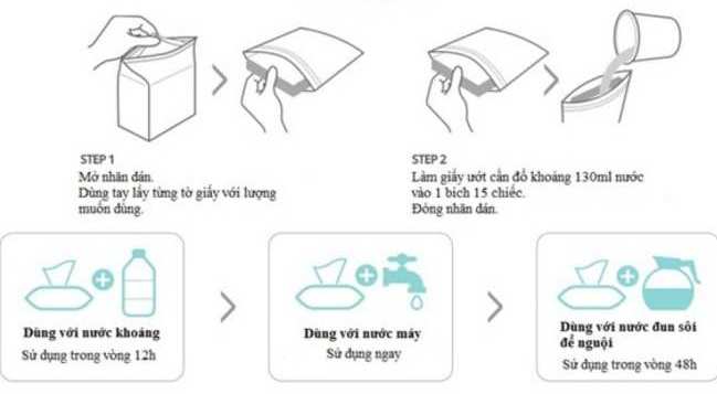 * Lưu ý chỉ sử dụng khăn đã đổ nước trong vòng 24h là tốt nhất và với mỗi loại nước khác nhau, thời hạn sử dụng cũng sẽ khác nhau: