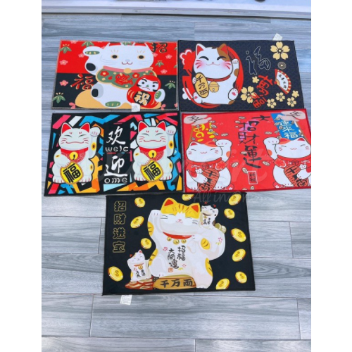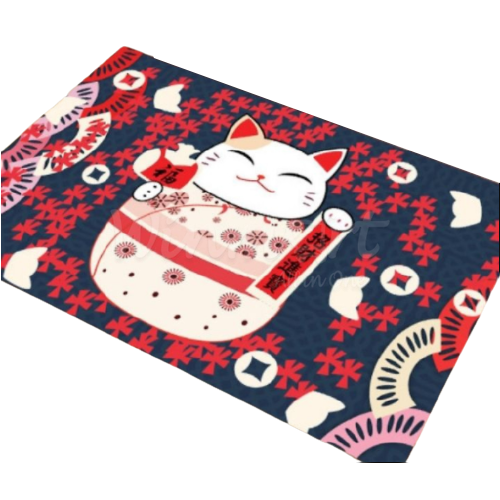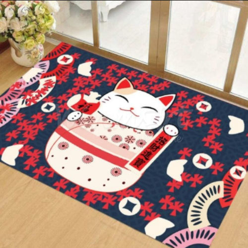 - Hình mèo thần tài được in nổi bật, không bị bai xù sau khi giặt. Ngoài công dụng làm thảm chùi chân thì còn dùng để trang trí nhà cửa.