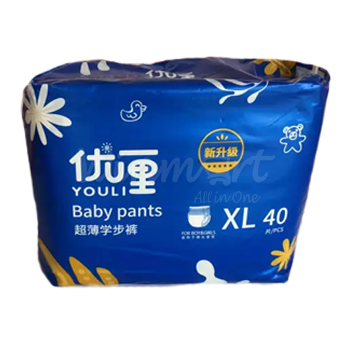 40 cái Tã quần size XL cho bé từ 12kg đến 17kg là bỉm cao cấp mới nhất nâng cấp từ dòng bỉm YOULI GOLD nội địa, bỉm tập trung vào 3 tính năng chính : SIÊU MỎNG - SIÊU THẤM - SIÊU THOÁNG. Do vậy, bỉm được thiết kế tính năng khóa nước cực kỳ thông mình giúp giảm tránh hăm mông bé. Mặt trong của bỉm có thiết kế với hàng ngàn các lỗ 3D siêu thấm hút, giúp hấp thu và khóa chất lỏng nhanh hơn. Bỉm Youli xanh sử dụng công nghệ lõi phức hợp, tăng thêm khả năng hút chất lỏng mạnh mẽ, không bị đứt đoạn, cứ có nước là thấm ngay. Nhờ đó giữ cho bề mặt bên trong bỉm luôn khô thoáng, hạn chế sự phát sinh của vi khuẩn gây mùi, gây bệnh hay hăm da.
