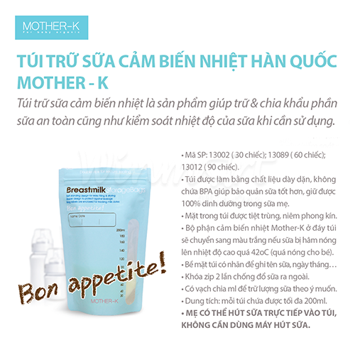 - Không chỉ là Túi trữ sữa thông thường, sản phẩm Túi trữ sữa cảm biến nhiệt Mother-K của Hàn Quốc còn có bộ phận cảm biến nhiệt. Nghĩa là có thể báo cho ba mẹ biết là sữa trữ bên trong đang lạnh hay nóng, có vượt nhiệt độ an toàn đối với bé hay không.