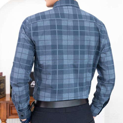 - Áo sơ mi nam trung niên màu xanh than dài tay họa tiết kẻ caro vải sợi tre chính là gợi ý tuyệt vời cho phái mạnh mỗi khi lựa chọn trang phục sơ mi đi làm mỗi ngày.
