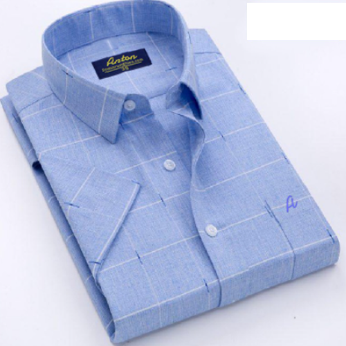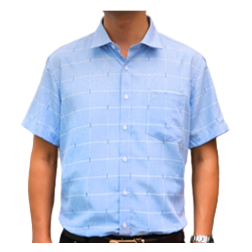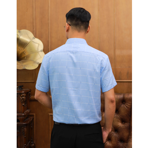 - Áo sơ mi nam trung niên màu xanh dương cộc tay họa tiết kẻ trắng vải sợi tre chính là gợi ý tuyệt vời cho phái mạnh mỗi khi lựa chọn trang phục sơ mi đi làm mỗi ngày.