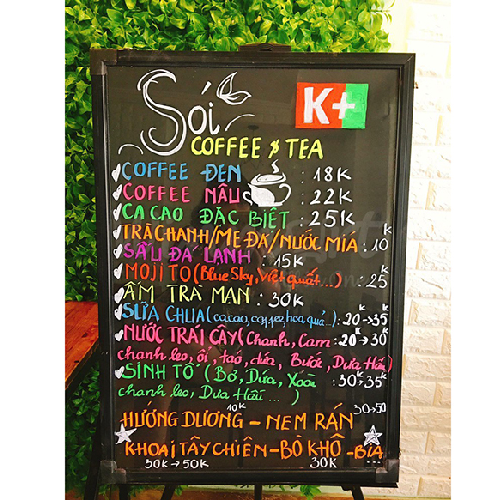 Bảng huỳnh quang có hệ thống đèn led chiếu sáng và chế độ nhấp nháy nhiều màu sắc. Menu được trình bày một cách sáng tạo với nội dung hình vẽ, chữ viết sinh động do chính tay chủ cửa hàng viết lên. Tạo phong cách riêng, độc đáo mà không cửa hàng nào có được.