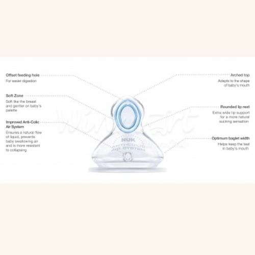 Ngoài ra, núm ti của bình sữa Nuk được sản xuất với đầu dẹp được cho là có tính chỉnh hình răng, chống tình trạng mọc lệch, biến dạng hàm. Hơn nữa, bạn hoàn toàn có thể linh hoạt trong việc thay thế núm ti của bình sữa Nuk bởi một chiếc núm ti khác nếu như bé không thích chiếc núm ti này.