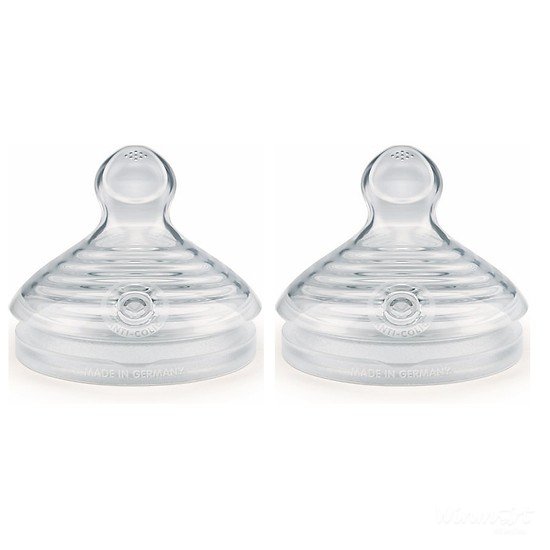 - Núm ti Nuk được làm từ chất liệu silicone hoặc cao su tự nhiên mềm dẻo, có 2 kích cỡ S1 (phù hợp cho bé 0-6 tháng) và S2 (phù hợp cho bé 6-18 tháng). Cỡ S (3 tia) dùng cho nước hoặc sữa mẹ; Cỡ M (6 tia) dùng cho sữa bột; Cỡ L (9 tia) dùng cho bột hoặc thức ăn đặc.- Xuất xứ: Đức.