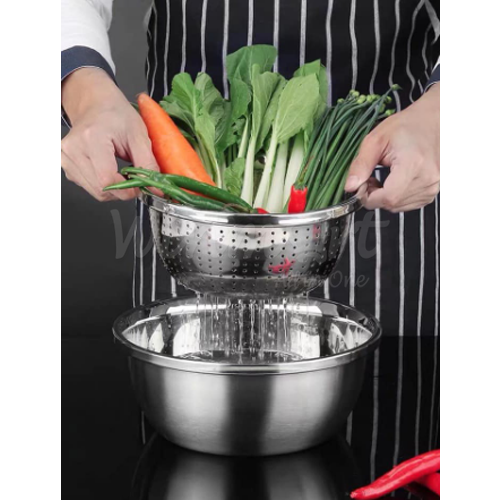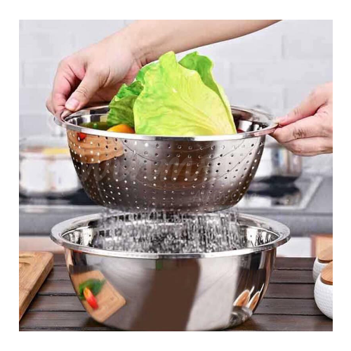 Bạn có thể sử dụng Rổ inox để làm dụng cụ ray, lọc các nguyên liệu chế biến món ăn như các loại bột, các loại hạt vỡ, ... Chậu/ Thau inox có thể sử dụng làm chậu đựng đồ khi lọc hoặc đựng bột chiên khô, bột chiên ướt, bột làm bánh, ...