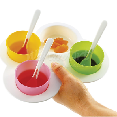 + 3 thìa mềm riêng biệt để chia thức ăn cho bé theo từng loại theo màu sắc của các cốc.