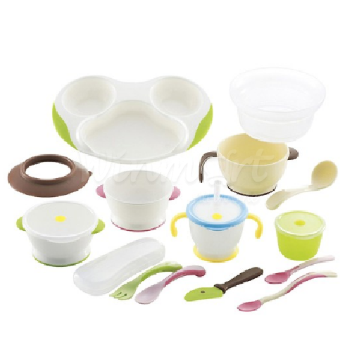 - Bộ sản phẩm gồm: 1 bát ăn có nắp, 1 bát ăn cơm,1 khay ăn 3 ngăn, 1 cốc nấu cháo/cơm nát trong lò vi sóng, 1 cốc 1 tay cầm, 1 cốc tập uống 3 giai đoạn, 1 hộp đựng đồ ăn nhỏ, 1 dụng cụ cắt mỳ, 2 thìa ăn, 1 bộ thìa dĩa tập ăn và 1 thìa nghiền.