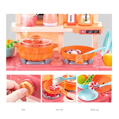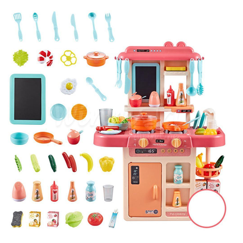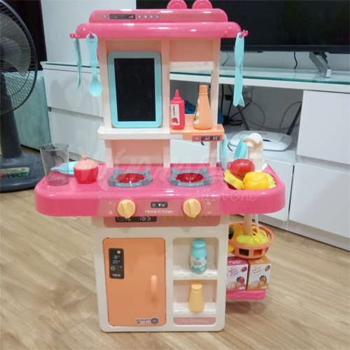 - Kích thước: 63.5*39*82, gồm các thành phần đầy đủ của 1 nhà bếp thật như bếp từ, xong, nồi, bát đĩa, dao thìa dĩa, lò nướng, vi sóng, tủ lạnh, hoa quả, đồ ăn, thực phẩm, ấm siêu tốc, bồn rửa bát có vòi nước chẩy thật, rổ rá,chạn bát..., có đèn và âm thanh nấu nướng như thật.