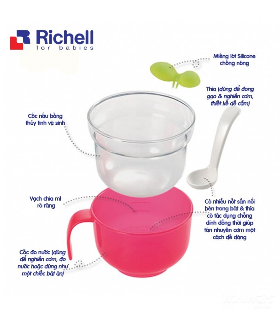 Cháo hay cơm nát là món ăn không thể thiếu trong mỗi bữa ăn của trẻ, nhưng thường mất khá nhiều thời gian để chế biến, và không phải bố mẹ nào cũng có đủ thời gian để nấu hàng ngày cho con, nhất là đối với những người phụ nữ đi làm việc tại văn phòng. Bộ nấu cháo hay cơm nát trong nồi cơm điện Richell - RC41850 là giải pháp thông minh và tiết kiệm giúp mẹ dễ dàng nấu cháo cho bé cùng lúc với việc nấu cơm cho gia đình. Bộ sản phẩm hứa hẹn sẽ mang đến cho bé sự phát triển tốt nhất cho những năm tháng đầu đời với các sản phẩm đa chức năng, thiết kế bắt mắt, hiện đại và sang trọng. Cốc nấu cháo tiện dụng, dành cho bé mới tập ăn dặm, chỉ cần đặt vào trong nồi cơm điện trong mỗi bữa ăn của gia đình, bạn sẽ có 1 chén cháo cho bé mà không cần mất thời gian nấu 1 nồi cháo riêng.