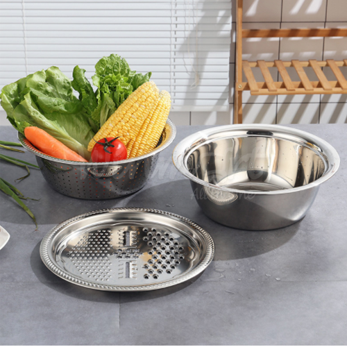 đa năng giúp tạo hình đẹp mắt cho các loại rau củ quả, trang trí cho món ăn thêm phần hấp dẫn. Bộ bao gồm : 01 Mặt nạo nhiều kiểu, 01 Rổ inox, 01 Chậu inox 100% cao cấp dày dặn. Nếu cần thái sợi