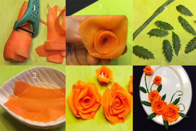 Bước 4: Dùng vỏ dưa chuột tỉa theo hình răng cưa để làm lá cho hoa hồng.
