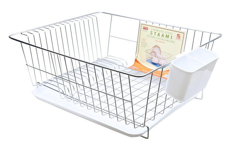 - Chạn chén bát inox ST_051 có kết cấu vững chắc, những thanh inox nhỏ đính ngang dọc với khung cho khả năng chịu tải tốt. Khoảng cách giữa các thanh inox được tính toán kỹ lưỡng, khoa học, đảm bảo tính cân đối, giữ cho vật dụng bên trên đứng vững và không bị rơi. Đặc biệt, sản phẩm thiết kế khay nhựa phía dưới để đựng nước, giúp sàn nhà hay bếp không bị ướt. Chạn chén bát còn trang bị thêm ống nhựa đựng thìa, đũa tiện lợi
