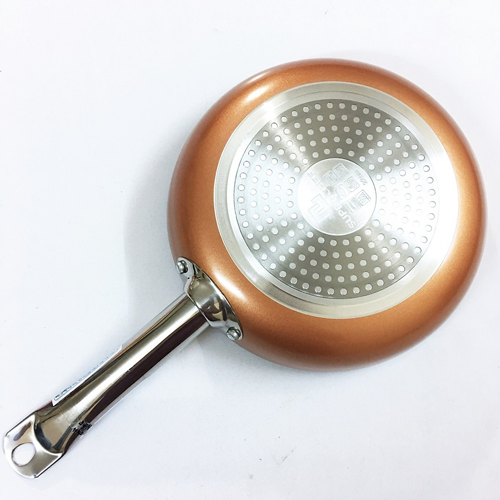 - Bên cạnh đó, tay cầm được làm bằng inox rỗng tán đinh vào thân chảo rất chắc chắn và hạn chế dẫn nhiệt làm nóng tay cầm.