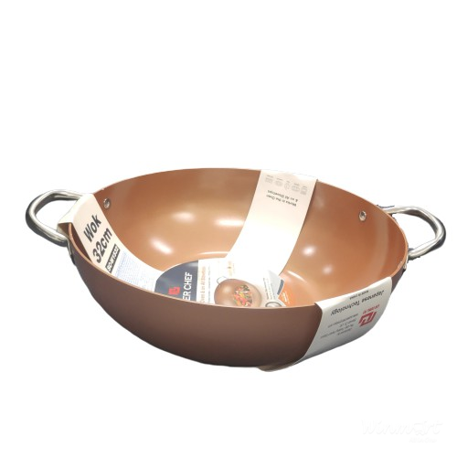 - Bề mặt chảo được phủ lớp chống dính Ceramic với màu vàng đồng, sáng bóng rất bắt mắt và làm tôn thêm vẻ sang trọng cho căn bếp, giúp tạo thêm cảm hứng, niềm vui để các chị em nội trợ sáng tạo, nấu ăn ngon hơn.