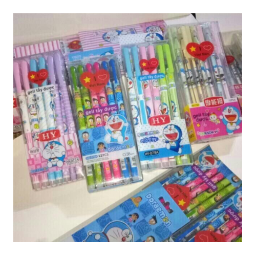Bút bi nước có tẩy được đóng hộp rất đẹp. Mặt trước hộp là nhựa trong suốt nhìn được những cây bút có họa tiết so cute bên trong. Mỗi hộp có 12 cây.