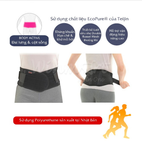 Đai sử dụng vải có tính đệm cao, chất liệu lưới kép Double Russel Mesh được dùng ở mặt trong của đai giúp nâng đỡ phần thắt lưng và phần hông hiệu quả. Thân của Đai được làm từ Nylon, Polyester, Polyurethane. Riêng phần khóa làm từ Polyacetal. Sử dụng chất liệu có tính năng cao ???????® của Teijin giúp đột phá làm biến tính mồ hôi thành acid yếu, kháng khuẩn, hạn chế mùi hôi, khử mùi hôi. Do vậy mà dù được sử dụng trong thời gian dài, mồ hôi ra nhiều, nhưng vẫn cho cảm giác sạch mới.