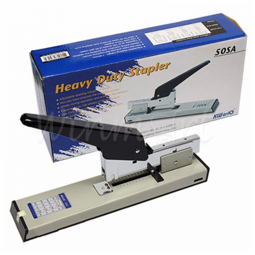 Dập ghim Kwtrio 50 SA có kết cấu hợp kim thép vững chắc, lý tưởng cho việc dập sổ sách dày. Sản phẩm được thiết kế có gạt căn lề có thể điều chỉnh dao động từ 7mm đến 65 mm, giúp cố định lề sổ sách khi dập.