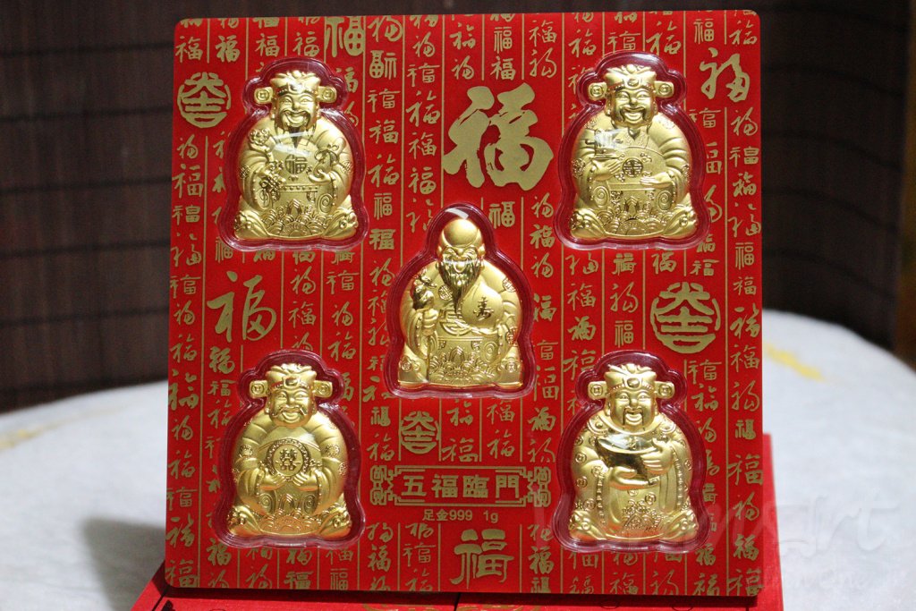 Bộ ngũ phúc là mẫu bao gồm 5 pho tượng với khuôn mặt cười tươi vui, tượng trưng cho ngũ phúc. Điểm đặc biệt là trên tay mỗi thượng cầm một con dơi theo mỗi cách khác nhau, bởi dơi còn gọi là phúc thử, trong tiếng Hán đồng âm với từ Phúc, được coi là biểu trưng của sự may mắn và tiền tài.