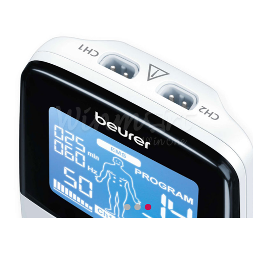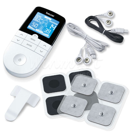 - Máy xung điện Beurer EM49 có hai kênh kích thích độc lập và bốn điện cực tự dính, cung cấp một loạt các chức năng giúp tăng