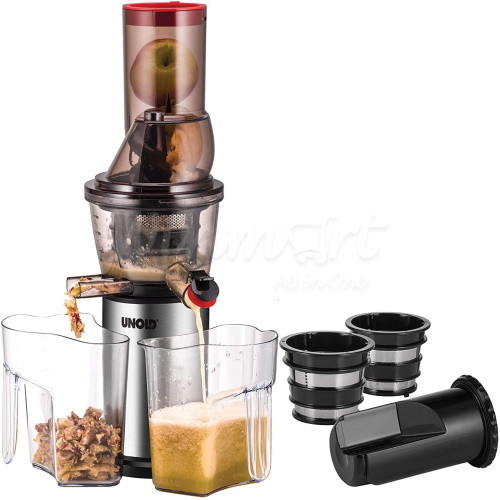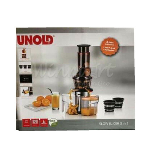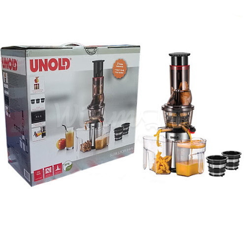- Nước ép từ máy ép chậm sẽ không bị tách nước như máy ép thường. Dung tích bình chứa 1 lít của máy ép chậm 3 in 1 của Unold giúp bạn chuẩn bị được những ly nước ép cho cả