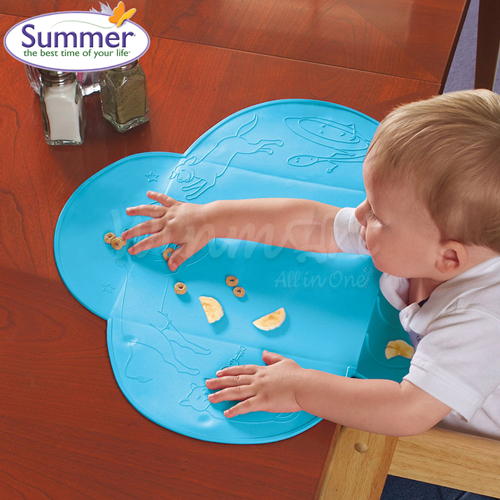Lót bàn tập ăn dặm xanh lơ - Blue Summer Infant dùng để lót trên bàn ăn dành cho bé trong giai đoạn tập ăn từ 6 tháng tuổi. Miếng lót bàn ăn dặm tạo ra một mặt phẳng sạch sẽ cho bé có thể thoải mái chơi đùa trên nó. Phía dưới có miếng hút giữ cho tấm lót được giữ chặt.