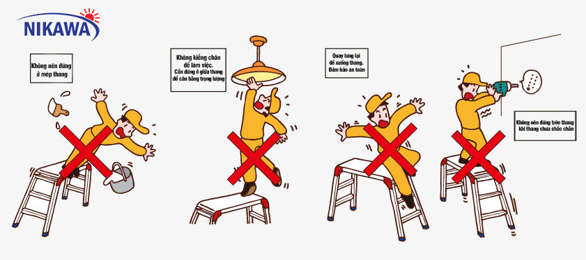 - Không nên đứng ở mép thang, không kiễng chân để làm việc, cần đứng ở giữa thang để cân bằng trọng lượng.