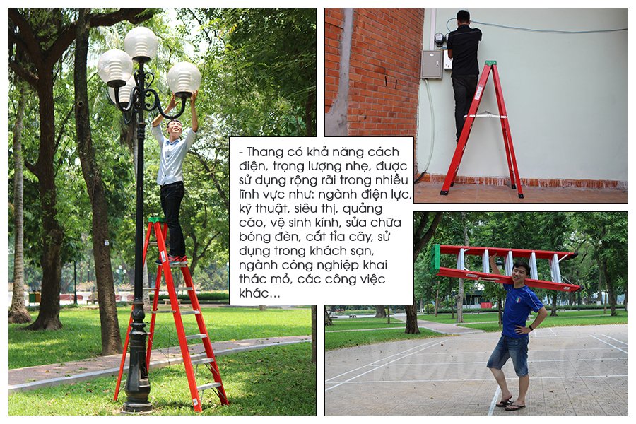 - Thang có khung bằng nhôm bền nhẹ phủ trên thành thang là lớp sợi thủy tinh cách điện an toàn tuyệt đối khi sử dụng để sửa chữa điện, bên ngoài phủ lớp sơn chống gỉ sét, bền đẹp với thời gian.
