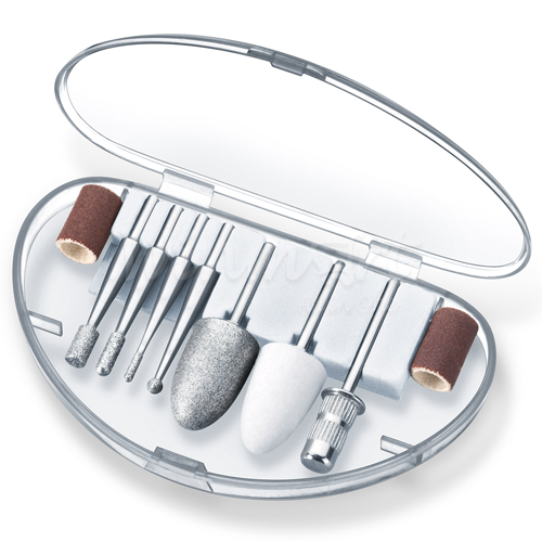 - Thiết bị làm móng MP 100 được trang bị 10 đầu làm móng chuyên nghiệp chất lượng cao. Các đầu làm móng chuyên nghiệp này được phủ một lớp sapphire bền chắc hoặc một lớp nỉ có tác dụng làm bóng móng.